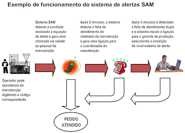 -Alertas escaláveis (sistema japonês de gerenciamento), os alertas podem ser escalados verticalmente para os distintos níveis de hierarquia. Ex: alerta gera uma ligação para a manutenção, se o alerta não for atendido em x tempo,é gerado um novo alerta para o coordenador da manutenção, se o alerta não for atendido, é gerado um outro alerta para a gerência de produção, e assim por diante.