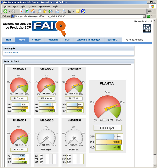 -Portal ANDON de planta, onde pode-se visualizar o estado da planta em tempo real, estado das linhas, operações em curso, operadores logados, índices de OEE, etc.. Além das informações de ANDON existem também os alertas gerados pelos operadores e o andamento dos mesmos (atendidos, não atendidos, tempo de atendimento).